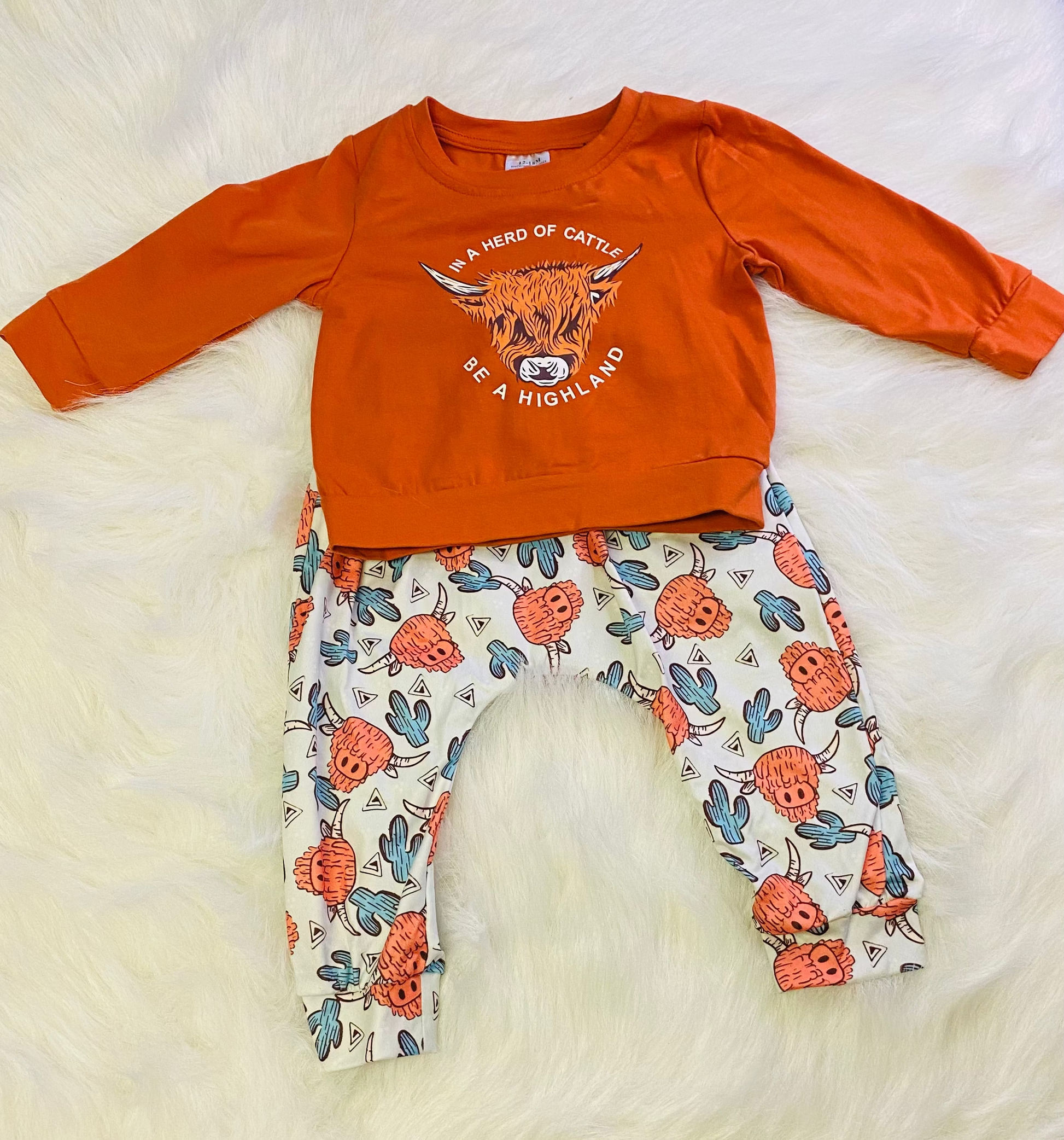 Orange Top with a Highland Cow and Cream pants with cactus and highland cow on it